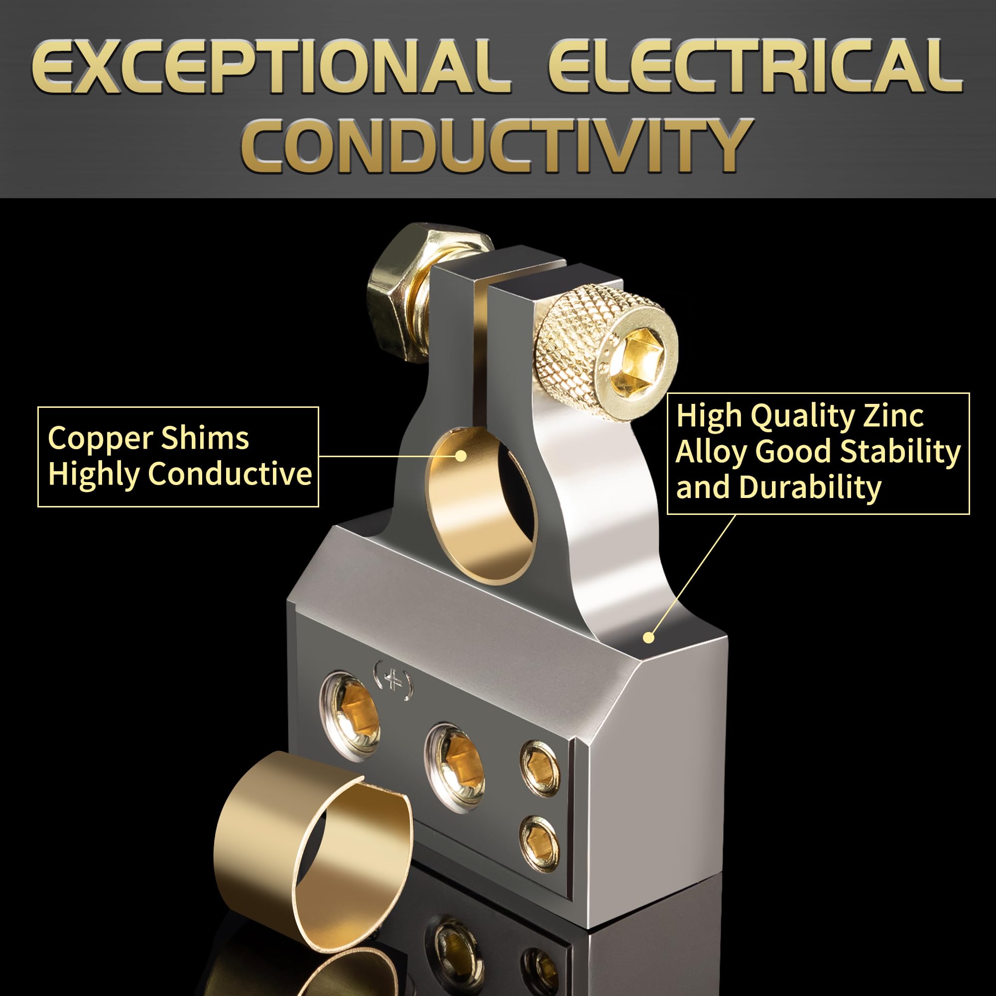 - Versatile Gauge Compatibility: Our terminal connectors feature one 2 gauge input, one 4 gaugr input and two 8/10 gauge inputs, making them compatible with a wide range of wire sizes and vehicle models