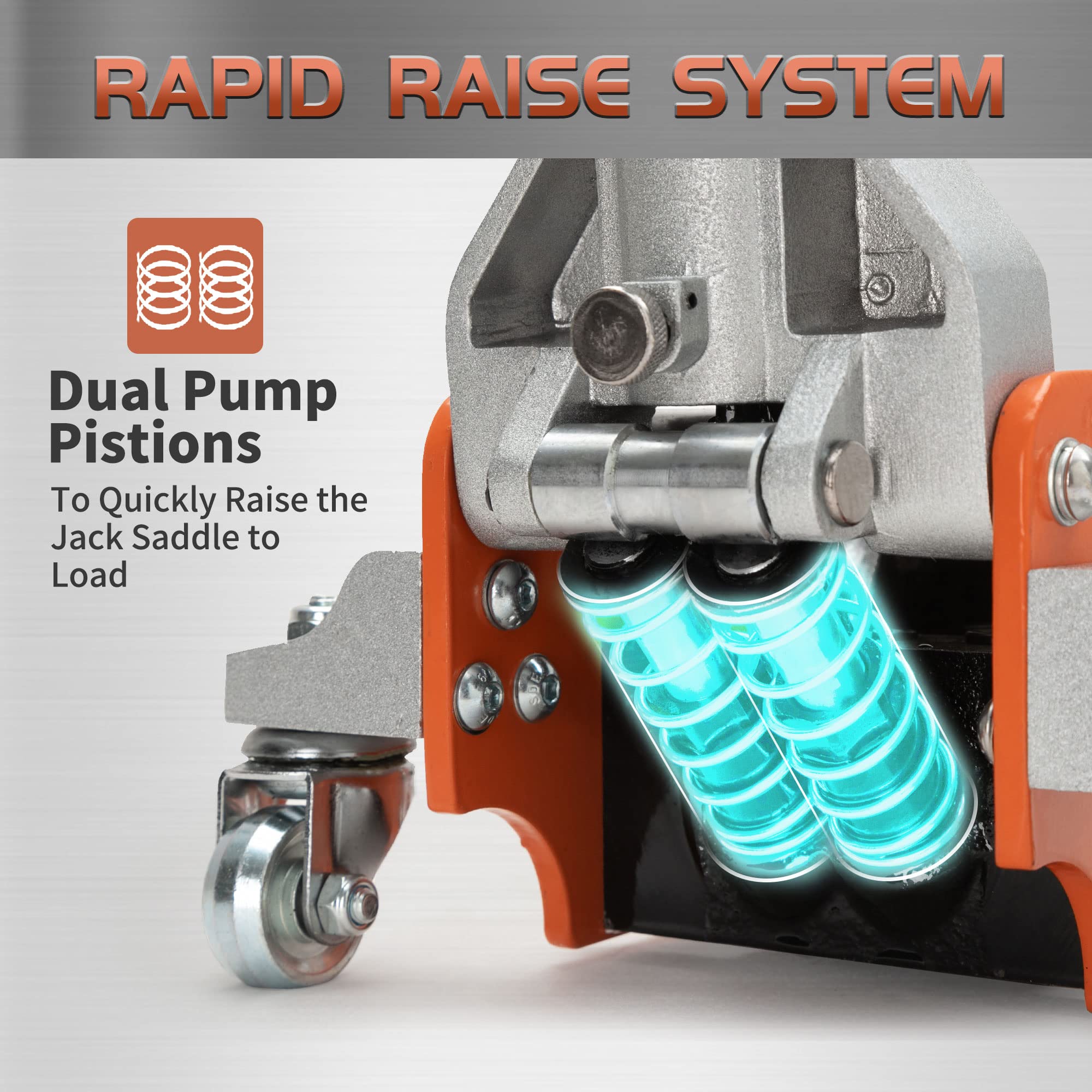- LIGHTNING-FAST LIFT: The dual pump pistons of our floor jack provide rapid raising so you can quickly and easily achieve the desired height for your vehicle